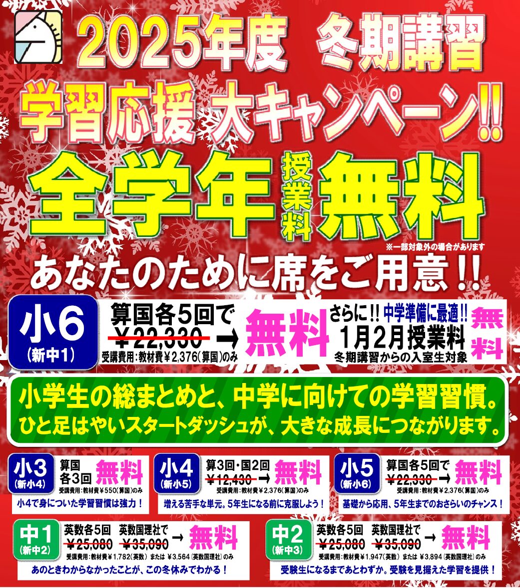 | 小6 | 冬期講習会無料 + 1月授業料無料 + 2月授業料無料 + 入室金無料 + 転塾応援制度 | |