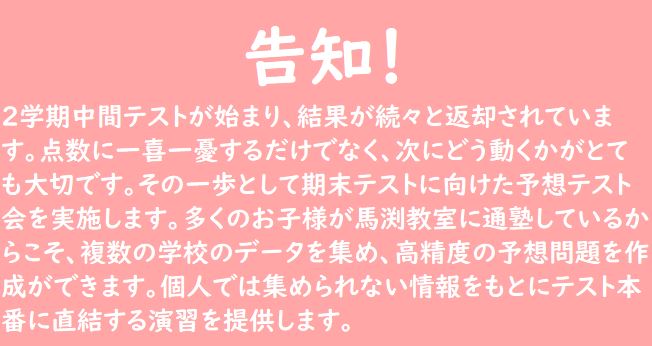 Q:定期テスト対策はありますか?A:定期テスト2週間前から、馬渕教室のカリキュラムを一旦ストップさせて、学校の定期テストで得点するための対策授業になります。過去問に頼るだけの指導ではなく、単元の解説や確認テストを行います。 |