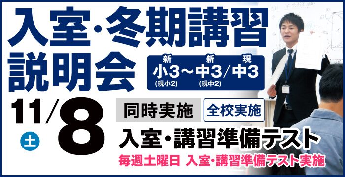 ◆入室説明会のご案内◆ 11月8日(土)15:00~16:15 講習準備テスト・入室テストと同時実施! 説明会だけのご参加も可能です。 対象:小4~中3生 《内容》 ①「馬渕教室の理念と取り組み」 ②「成績を伸ばす馬渕の教育システム」 ③「オープンクラス(模擬授業) 算数・英語など」 |