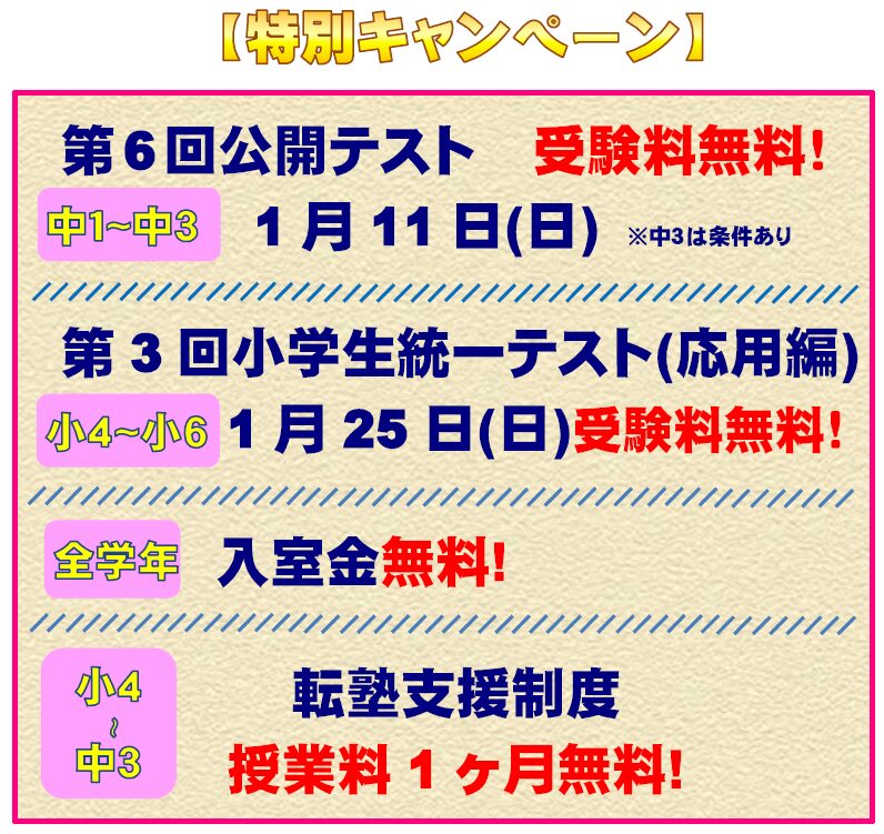 | 【主な検索キーワード】#夏期講習 #受験 #入試 #高校受験 #高校入試 #公立 #私立 #合格 #実績 #成績 #内申 #点数 #定期テスト #テスト対策 #講習 #春期講習 #夏期講習 #冬期講習 #北野 #天王寺 #大手前 #四條畷 #寝屋川 #清水谷 #八尾 #夕陽丘 #無償化 #石切中 #枚岡中 #孔舎衙中 #石切小 #石切東小 #枚岡西小 #枚岡東小 #英田北小 #英田中 #縄手北小 #縄手北中 #学習塾 #小2 #小3 #小4 #小5 #小6 #中1 #中2 #中3 #小学生 #中学生 #応援 #統一テスト #無料 #キャンペーン #関関同立 #京大 #東大 #小学生統一テスト |