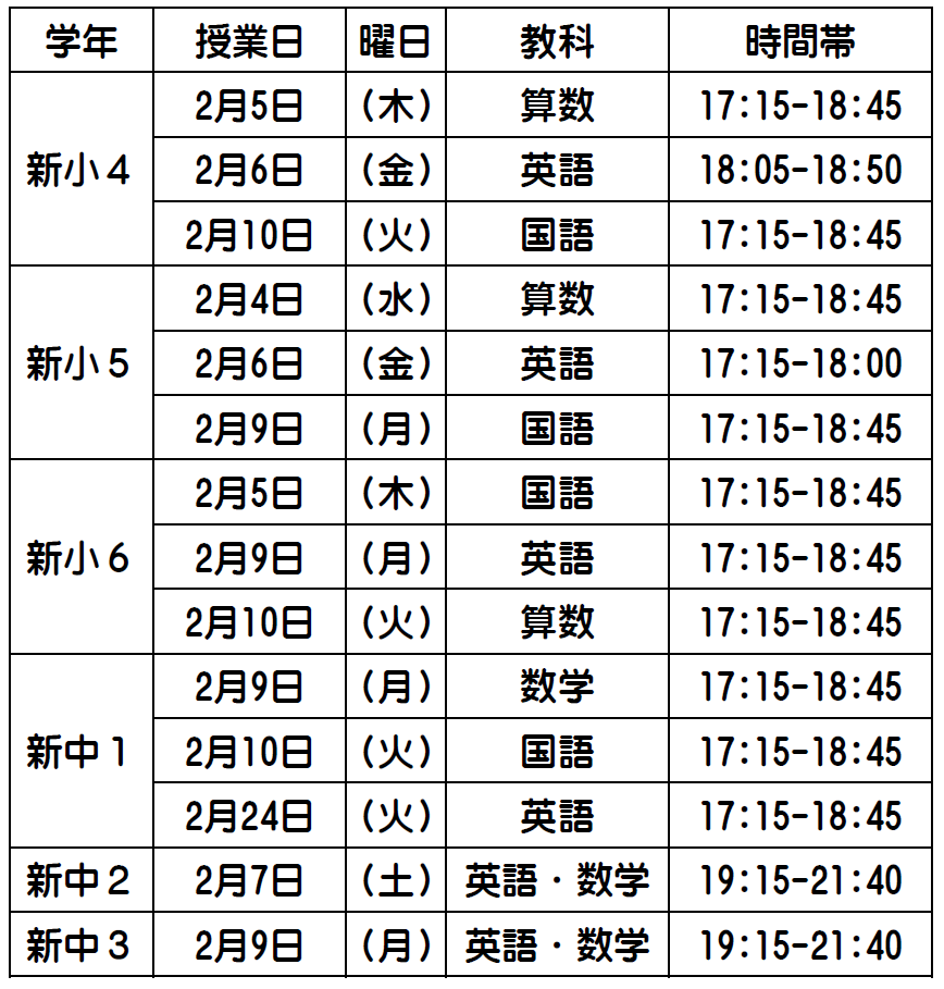 | ●新小2・新小3● □コアスタディ説明会 -授業の実演もあります- 2月14日(土)13:00~14:00 □進度判定テスト 毎週土曜日 15:00~15:30 ※ 進度判定テストは、平日の受験も可能です。 □ 実施教科 国語10分・算数20分 □ 受験料 無料 お電話かホームページよりお申込みください。 |