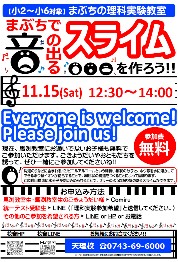 | さらに!! 馬渕教室では勉強だけでなくお楽しみイベントも開催しています!! 今回は「音の出るスライム」作りです!! 対象は小2~小6となりますのでごきょうだいでご参加いただけます!! □日時:11/15(土) 12:30~14:00 お申込みはこちら。 |