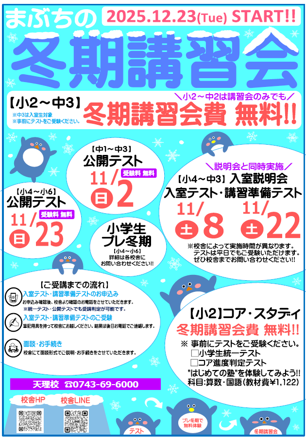| ✐入室テスト・講習準備テストのご案内✐ □毎週土曜日 15:00~16:15 ※平日の受験も可能です。 □実施教科 小4~中1▶▶▶国語・算数(数学) 中2~中3▶▶▶英語・数学 □受験料 無料 お電話かホームページよりお申し込みください。 ●小4~中3● ✐入室説明会のご案内✐ 11月8日(土)13:00~14:15 ※入室テストも同時開催!! ※個別でのご説明も可能です。 |