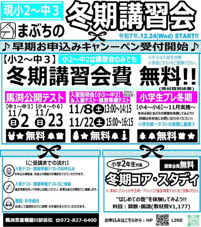 馬渕教室の冬期講習会は12/24(水)からスタート。