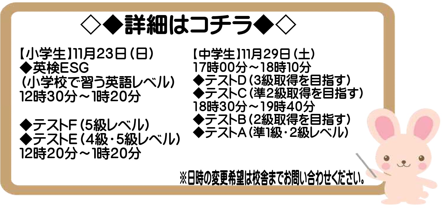 | ●入室・講習準備テスト実施スケジュール● □ 日時 毎週土曜日 15:00~16:20 □受験科目 新小4~新中1 算数・国語 新中2~現中3 英語・数学 上記日程がご都合悪い場合は平日も承りますのでご相談ください。 お申込みはコチラ⇒クリック |
