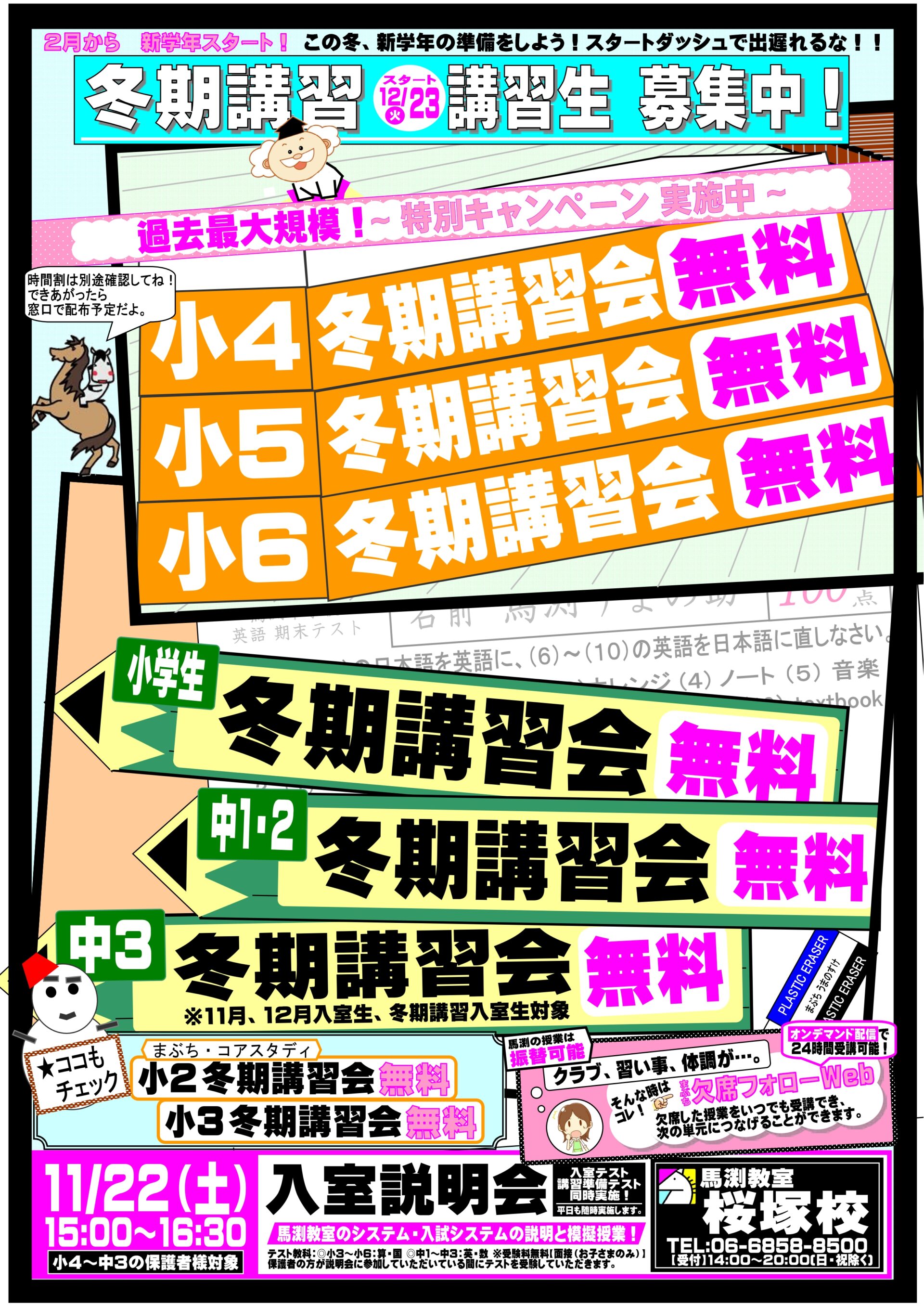 | 新中1 (現小6) | プレ冬期▶冬期講習会▶1月(スクーリング)▶2ヶ月授業料 無料 | |
