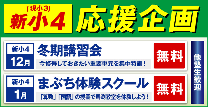 | A:馬渕教室では入室の際にテストを受験していただいています。このテストに合格された方は、塾の授業に十分についていける学力をお持ちです。つまずいた単元や分からない宿題などは随時、質問対応やまぶち欠席フォローWebにてフォローしますので、合格なさったなら安心して馬渕教室に入室してください。勉強やクラブ・習い事など目一杯頑張る君を馬渕教室は全力で応援します。 |