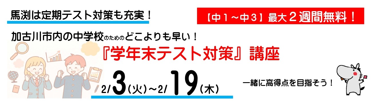 馬渕教室の定期テスト対策授業は、各中学校ごとに異なる定期テスト日程に合わせて実施!定期テスト対策の専用教材を用いて、ポイントをおさえて、徹底的にサポートいたします!詳細は校舎にお問い合わせください!