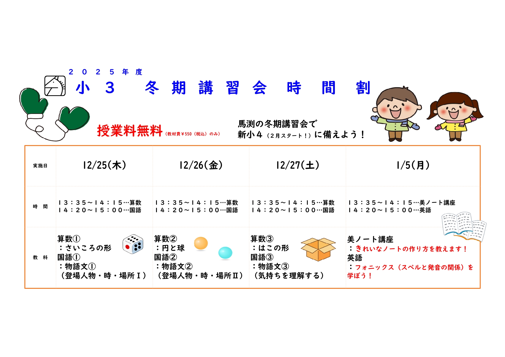 ▼小学3年生の冬期講習会の時間割はこちら✨▼