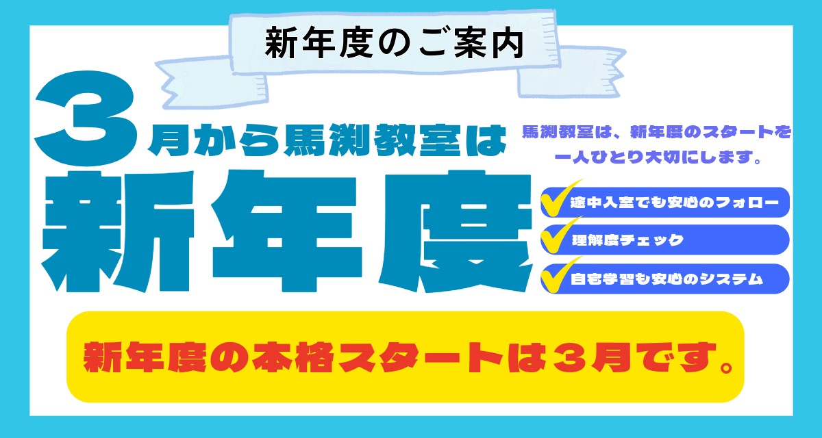 Q:馬渕教室についていけるか心配です。A:馬渕教室では入室の際にテストを受験していただいています。 このテストに合格された方は、塾の授業に十分についていける学力をお持ちです。 つまずいた単元や分からない宿題などは随時、質問対応や宿題サポートWebにて フォローしますので、合格なさったなら安心して馬渕教室に入室してください。 勉強や部活・習い事など目一杯頑張るみなさんを馬渕教室は全力で応援します。 |