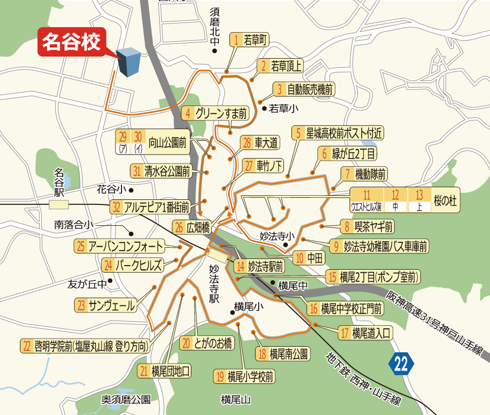 若草町、緑が丘、桜の杜、妙法寺、横尾、道正台、清水台 方面