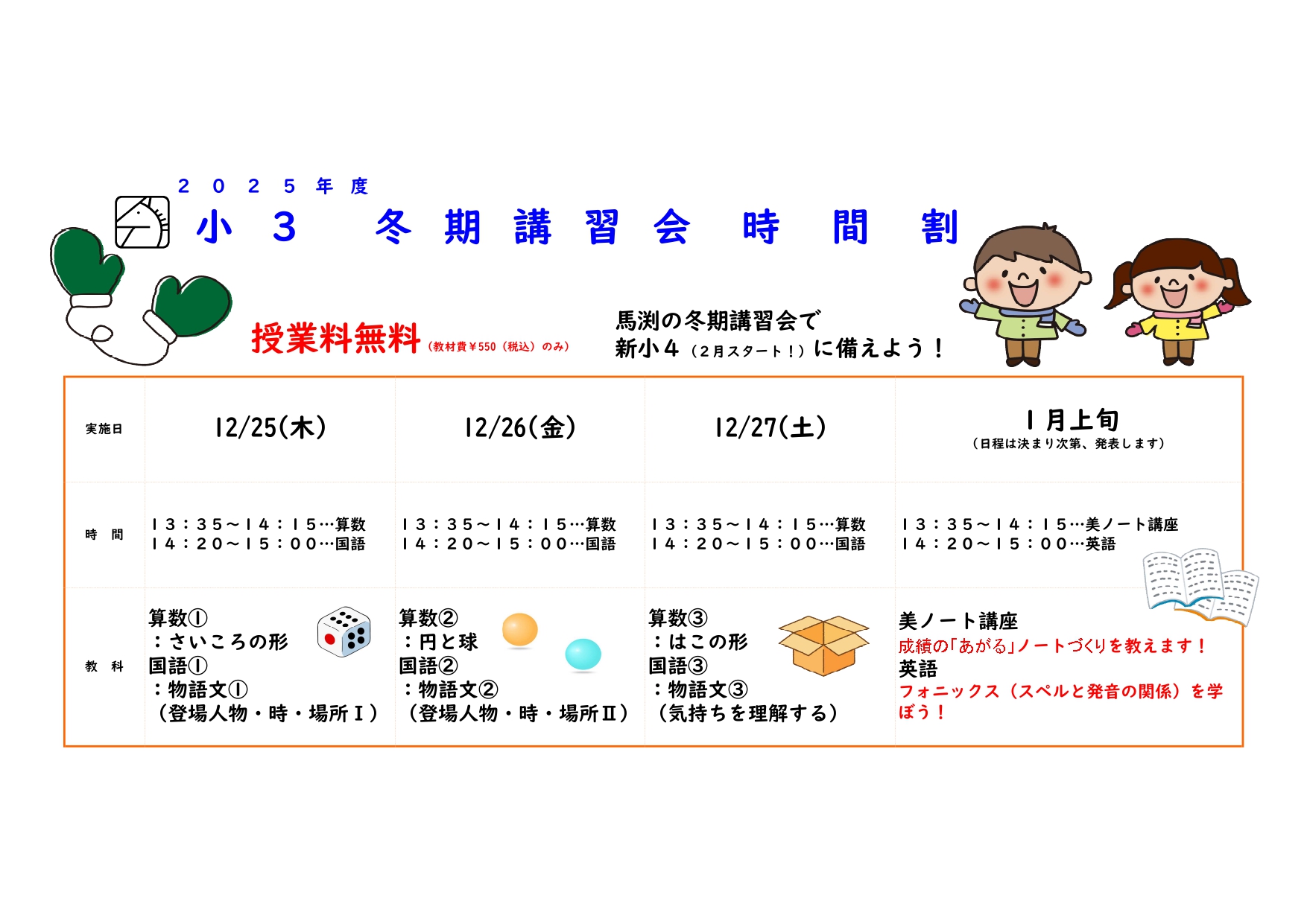 ▼小学3年生の冬期講習会の時間割はこちら✨▼