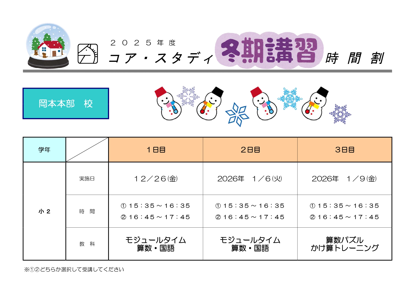 ▼小学2年生の冬期講習会の時間割はこちら✨▼