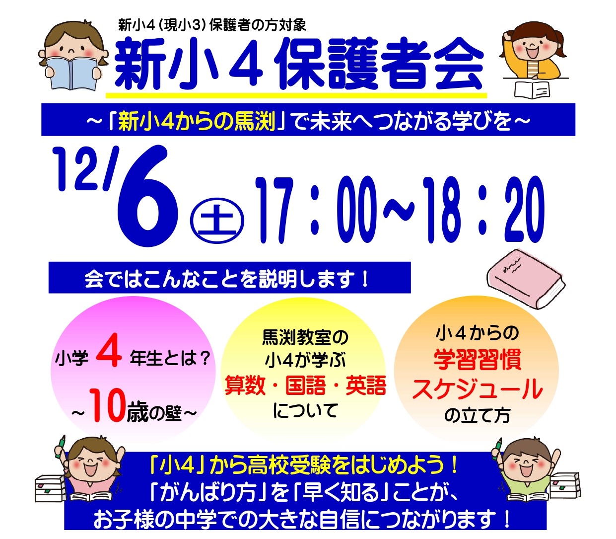 A:馬渕教室ではご入室の際に学力診断テストを受験していただいています。このテストにおいて、受講資格を得られた方は、馬渕教室の授業に十分ついていける学力をお持ちです。入室前に未習単元がある場合やつまづいた単元や分からない問題などは随時質問対応や宿題サポートWebにてフォローします。受講資格を得られた場合は安心して馬渕教室に入室してください。勉強や部活 ・習い事などめいっぱい頑張る皆さんを馬渕教室は全力で応援します。
