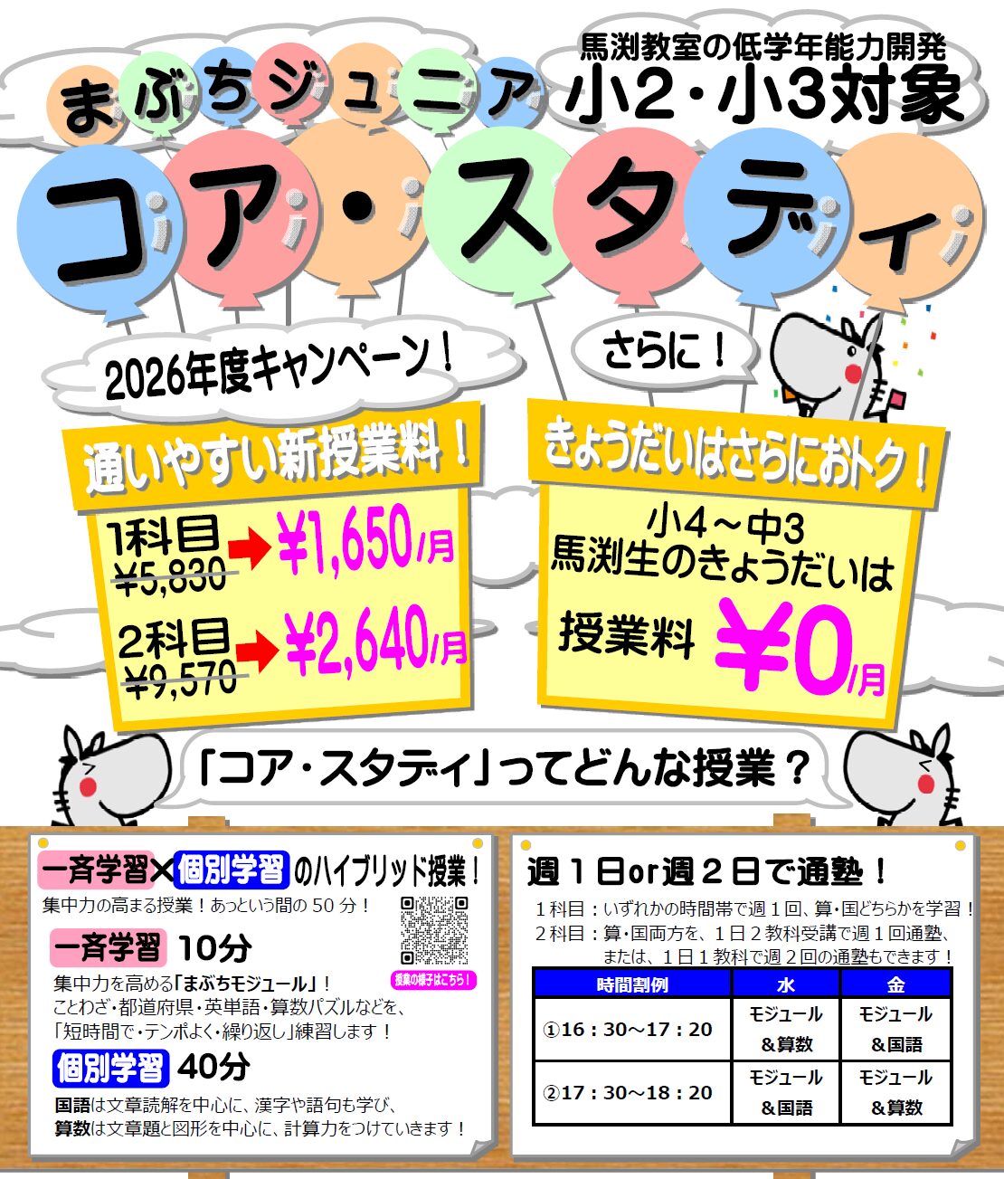 A:早くから学習習慣をつけることはより深く理解するためにもお勧めします。小学校低学年は一生のうちで脳の吸収力が最も高いと言われています。この大切な時期に学力や思考力の基盤を身につけることによって、受験のみならず将来のあらゆる場面で必要となる「考える力」を養います。算・国能力開発コア・スタディは学ぶ楽しさ、できる喜びを体感させ、子どもたちの将来の可能性を見つけ出し、大きく育てることを目標としています。