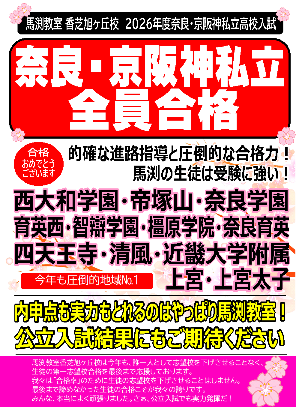 近くの他塾と比べても、奈良高校 受験者全員合格の塾は馬渕教室香芝旭ヶ丘校だけです。