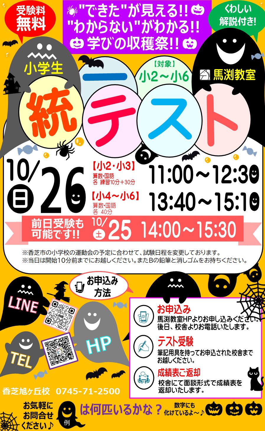 香芝旭ヶ丘校は小学校の運動会の予定に合わせて10/19(日)ではなく、10/26(日)・10/25(土)に開催いたします。