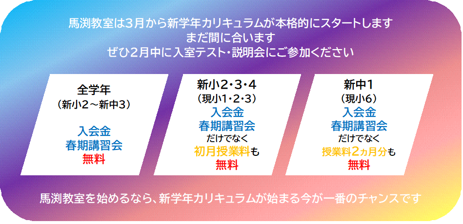 馬渕教室へ入室を希望される方は、「入室テスト」を受験して入室資格を取得してください。受験には事前のお申し込みが必要です。校舎までお電話いただくか校舎窓口にてお申し込みください。
