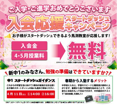 | ●小4~中3● ✐入室説明会のご案内✐ □4月4日(土) 13:00~14:20 ※入室テストを同時実施。 ※説明会以外の日程での個別でのご説明も可能です。 ✐入室テスト及び講習準備テストのご案内✐ □毎週土曜日 15:00~16:15 ※ 平日の受験も可能です。 □ 実施教科 新小4~新中1…国語・算数 新中2~新中3…英語・数学 □ 受験料 無料 お電話かホームページよりお申込みください。 |