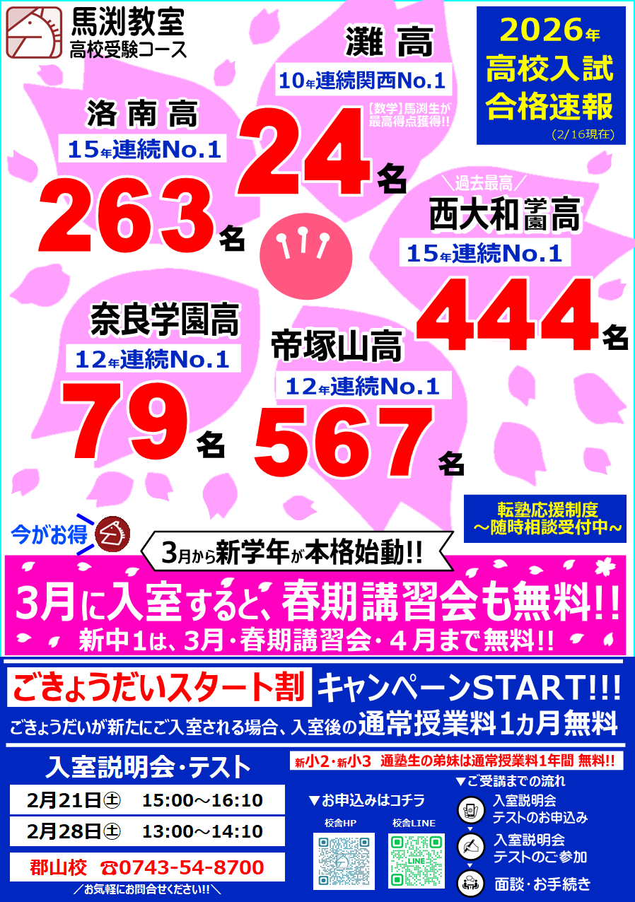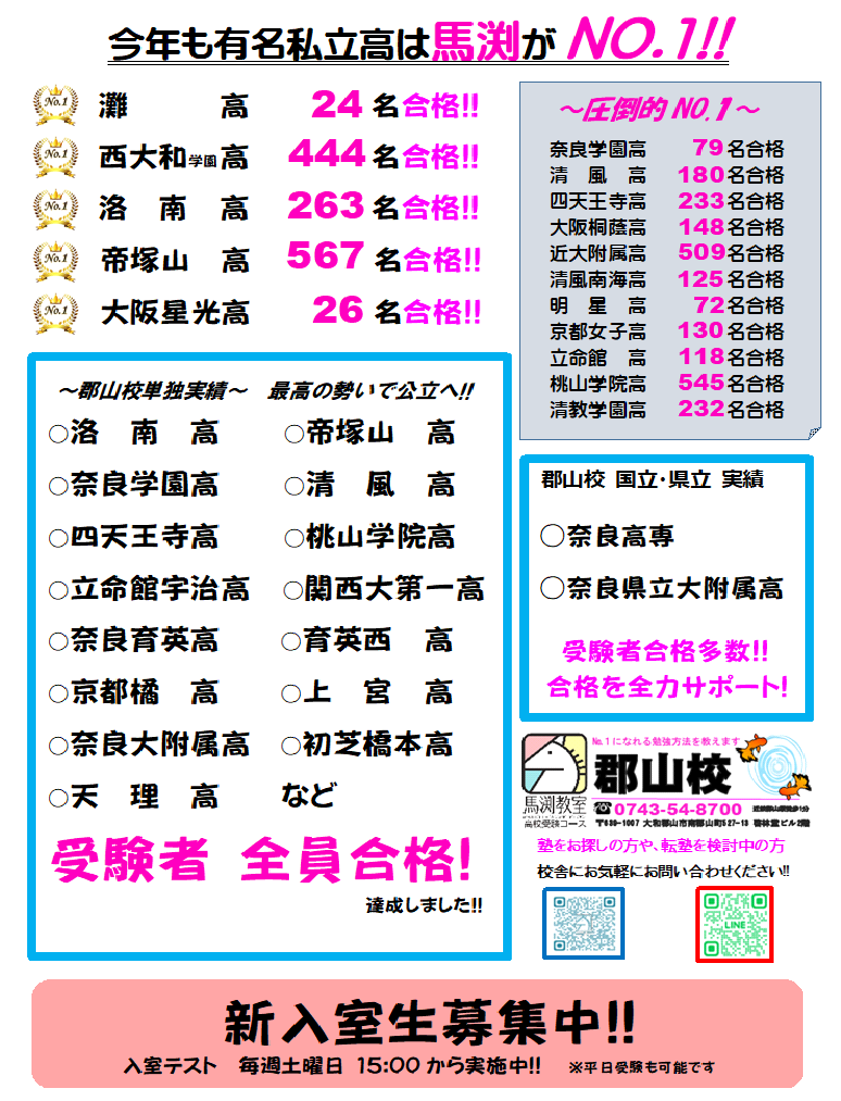 受験 高校入試 公立 私立 合格 実績 最難関 成績 内申 点数 定期テスト テスト対策 講習 春期講習 夏期講習 冬期講習 ナンバー1 No.1 奈良 畝傍 郡山 転塾 応援 一条 高田 橿原 無料 半額 還元