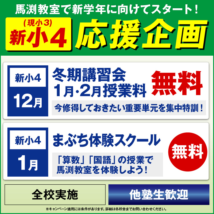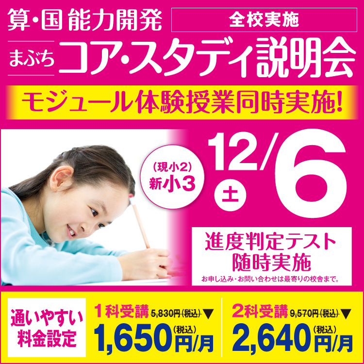 | 脳の吸収力がもっとも高いと言われる小学校の低学年の時期に、基礎学力・思考力の基盤を身につけるのが『まぶちコア・スタディ』です。一斉授業と個別指導のハイブリッド型指導で、お子様の学力を伸ばします。まずは進度判定テストの受験をオススメします。 進度判定テスト 毎週土曜日 15:00~15:30 ※平日の受験も可能です。 試験教科(計30分): 小2・小3…国語・算数・面接 持ち物:筆記用具 受験費用:無料 |