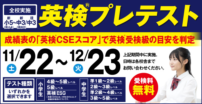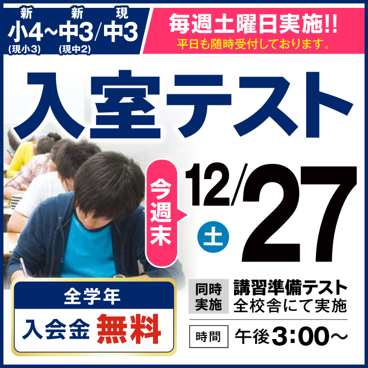 | 入室テスト 毎週土曜日 15:00~16:40 ※平日の受験も可能です。 試験教科(各40分): 小4~中1…国語・算数 中2・中3…英語・数学 持ち物:筆記用具 受験費用:無料 |