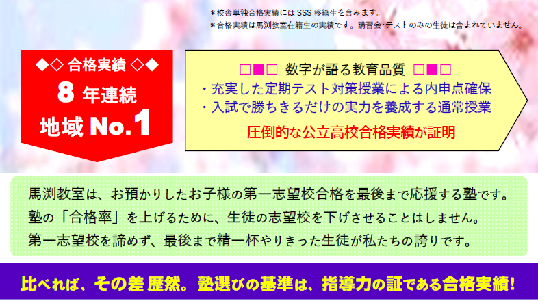 合格実績にはその塾の指導力が反映しています。教科指導力、使用教材内容、適切な進路指導とそれを実現するための精緻なデータ、そしてフォロー体制。それら総合的な指導力が全て整うことで合格実績につながります。「塾の規模が違う」というのであれば、校舎単位で比較されてはいかがでしょうか。数字が語る教育品質、感情ではなくデータに基づき塾選びをすることが大切です。馬渕教室の指導力の高さにご期待ください!