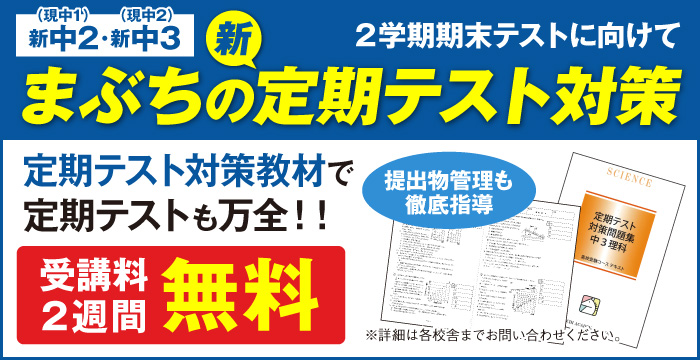 馬渕の定期テスト対策授業は、通塾されていない方も無料で参加いただけます、是非ご利用ください。なお、対策授業実施日は各中学により異なります。詳細はお問い合わせください。