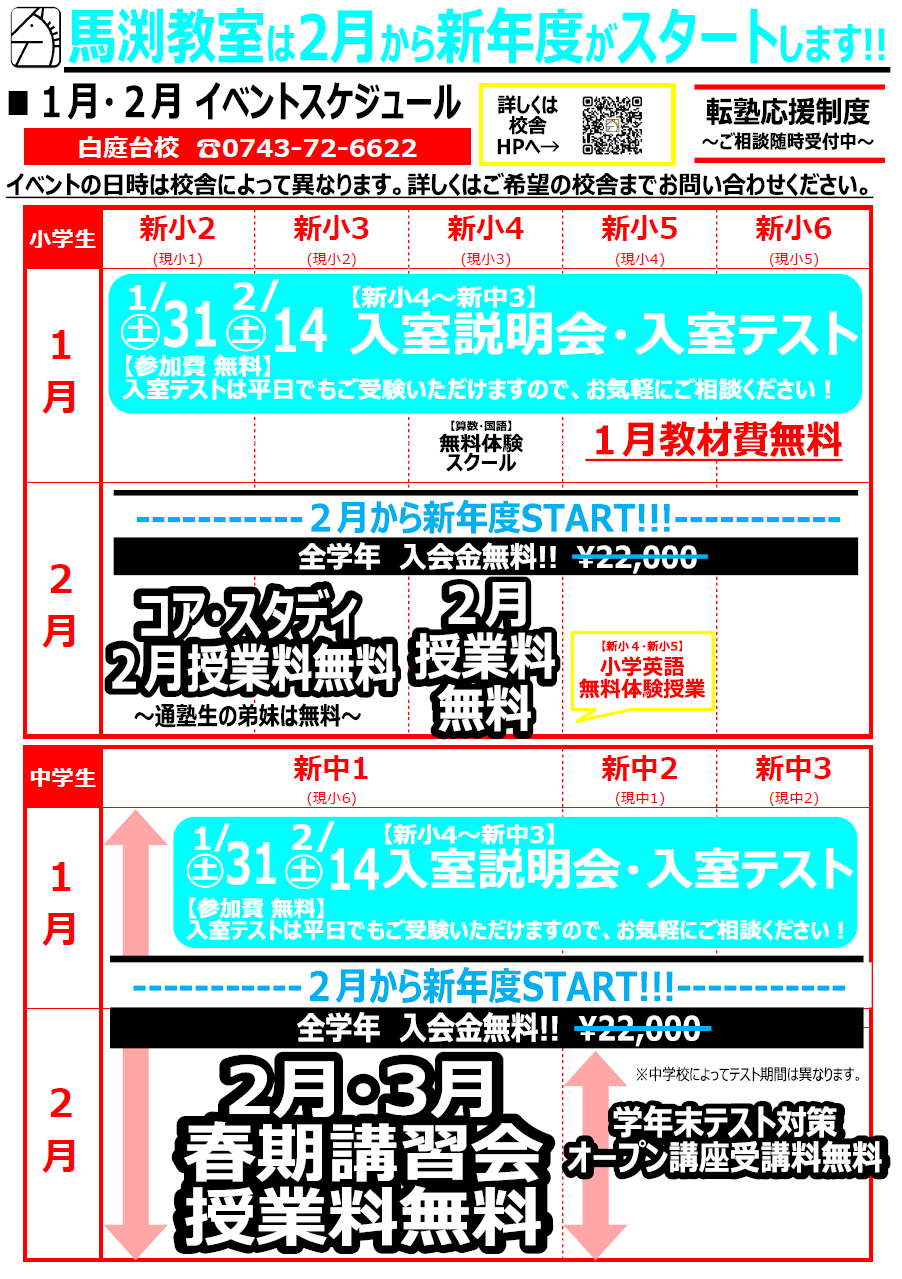 | ●新小4(現小3)~新中3(現中2)および現中3● ✐入室テストのご案内✐ □毎週土曜日 15:00~16:20 ※ テストのみであれば、平日の受験も可能です。 □ 実施教科 新小4~新中1…国語・算数 新中2~現中3…英語・数学 □ 受験料 無料 お電話かホームページよりお申込みください。 |