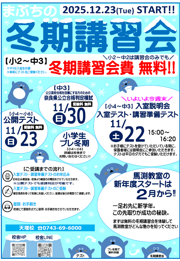 | ✐入室テスト・講習準備テストのご案内✐ □毎週土曜日 15:00~16:15 ※平日の受験も可能です。 □実施教科 小4~中1▶▶▶国語・算数(数学) 中2~中3▶▶▶英語・数学 □受験料 無料 お電話かホームページよりお申し込みください。 ●小4~中3● ✐入室説明会のご案内✐ 11月22日(土)15:00~16:15 ※入室テストも同時開催!! ※個別でのご説明も可能です。 |