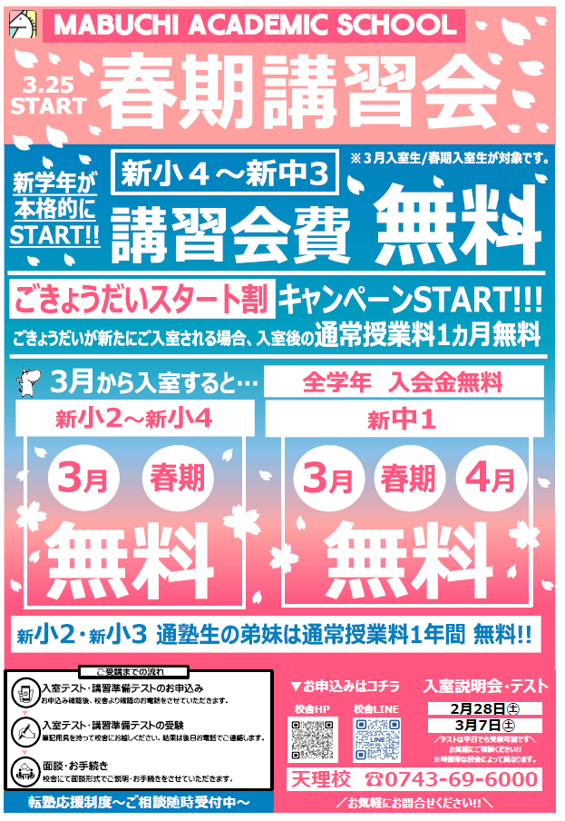 | ✐入室テスト・講習準備テストのご案内✐ □毎週土曜日 15:00~16:15 ※平日の受験も可能です。 □実施教科 小4~中1▶▶▶国語・算数(数学) 中2~中3▶▶▶英語・数学 □受験料 無料 お電話かホームページよりお申し込みください。 ●小4~中3● ✐入室説明会のご案内✐ 3月7日(土)15:00~16:20 ※入室テストも同時開催!! ※個別でのご説明も可能です。 |