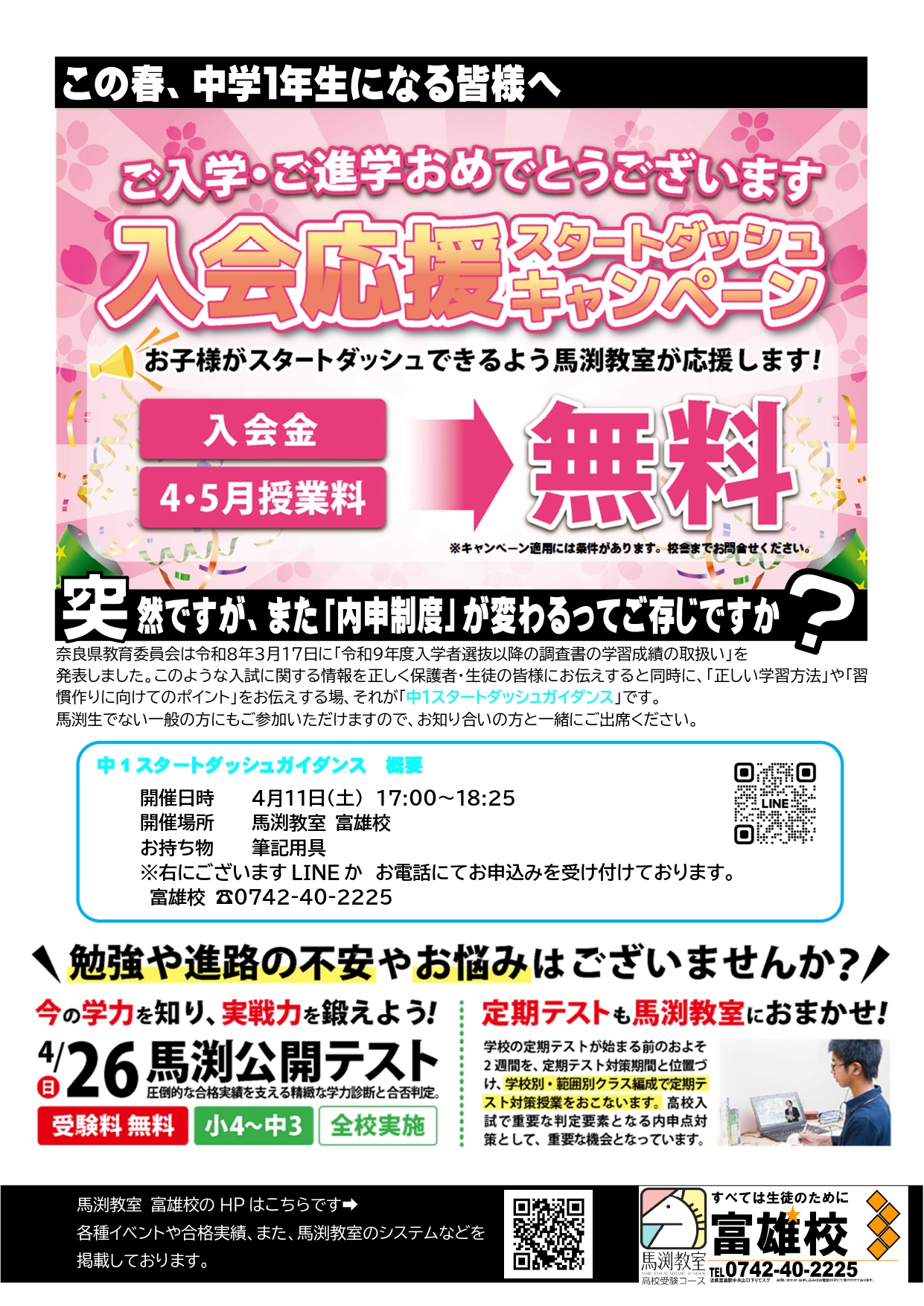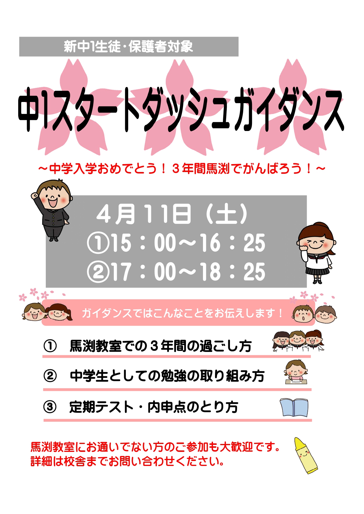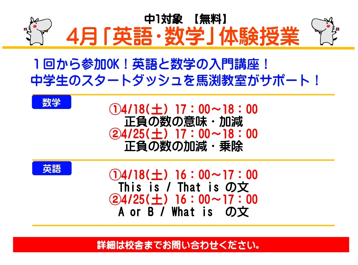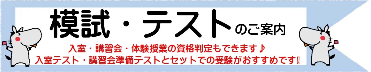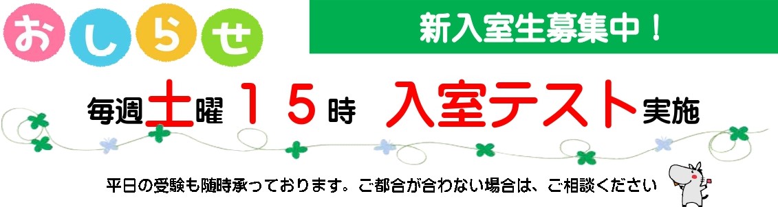 | ●新小4~新中3● ✐入室テスト・講習準備テストのご案内✐ □毎週土曜日 15:00~16:20 ※ テストのみであれば、平日の受験も可能です。 □ 実施教科 新小4~新中1…国語・算数 新中2・新中3…英語・数学 □ 受験料 無料 お電話かホームページよりお申込みください。 |