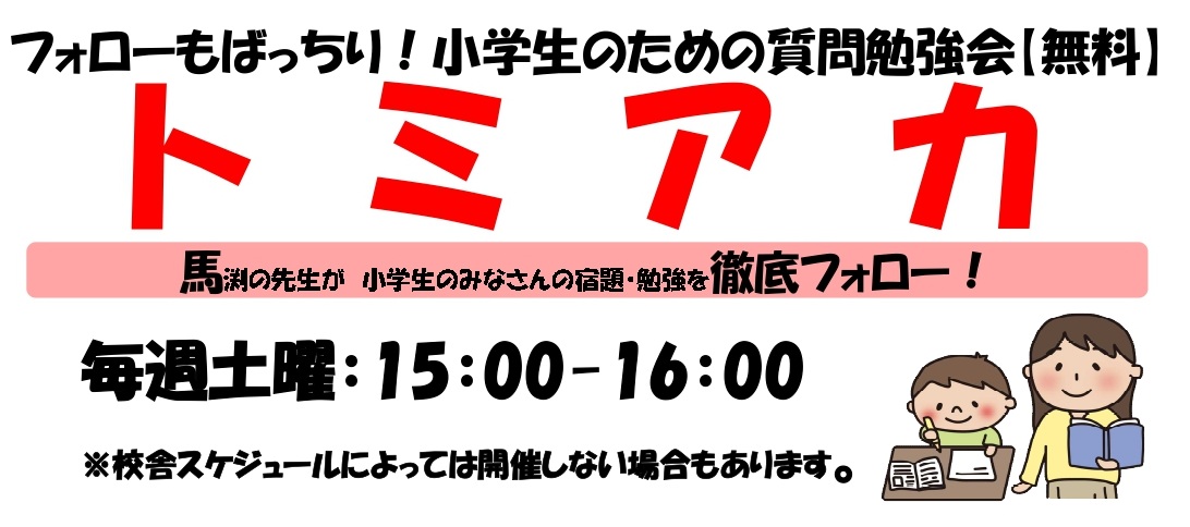 | Q:馬渕教室についていけるか心配です。 A:馬渕教室では入室の際にテストを受験していただいています。このテストに合格された方は、塾の授業に十分についていける学力をお持ちです。つまずいた単元や分からない宿題などは随時、質問対応やまぶち欠席フォローWebにてフォローしますので、合格なさったなら安心して馬渕教室に入室してください。勉強やクラブ・習い事など目一杯頑張る君を馬渕教室は全力で応援します。 |