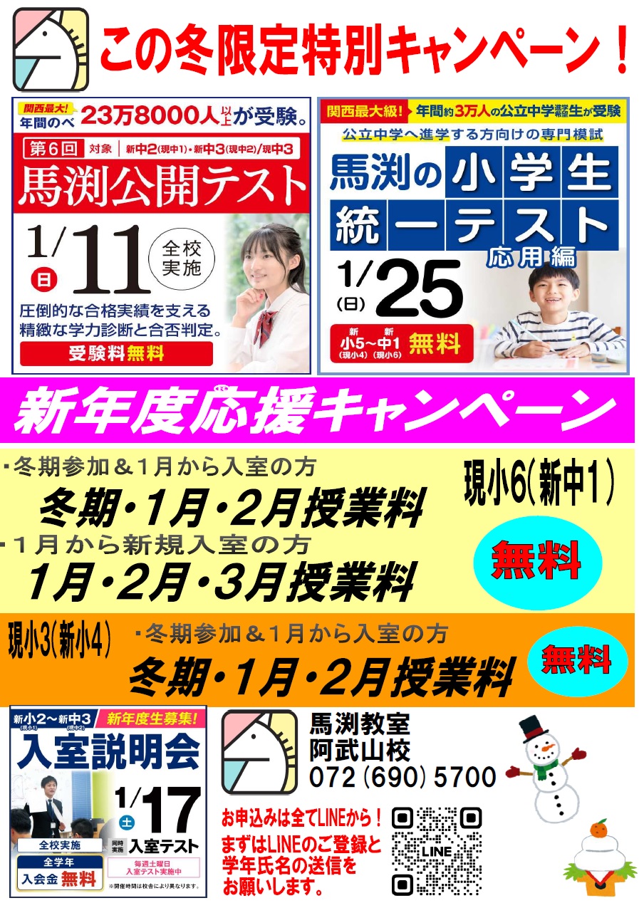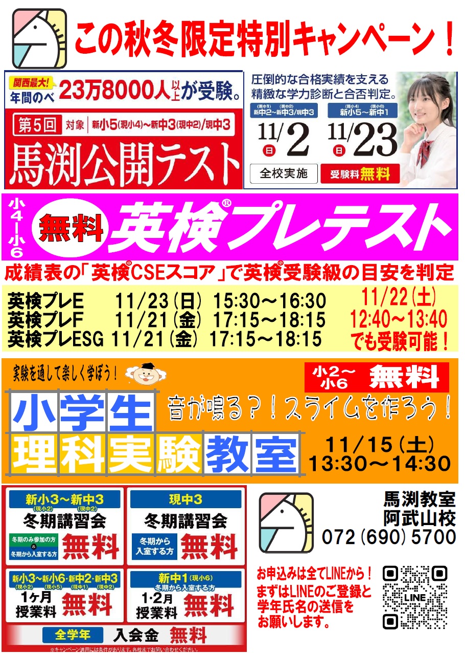 | 内容 | 「最新の入試情報~共通テストから大阪府公立入試まで~」 「成績を伸ばす馬渕の教育システム」 「オープンクラス(模擬授業) 算数・英語など」 |