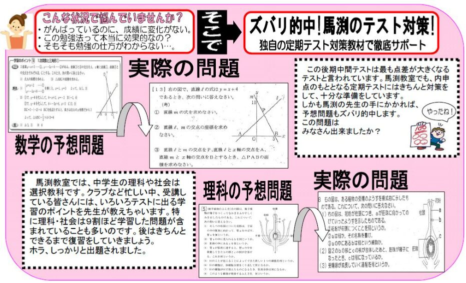 過去問に頼るだけの指導ではなく、単元の解説や確認テストを行います。定期テスト対策も馬渕にお任せください!2週間無料体験もできます。