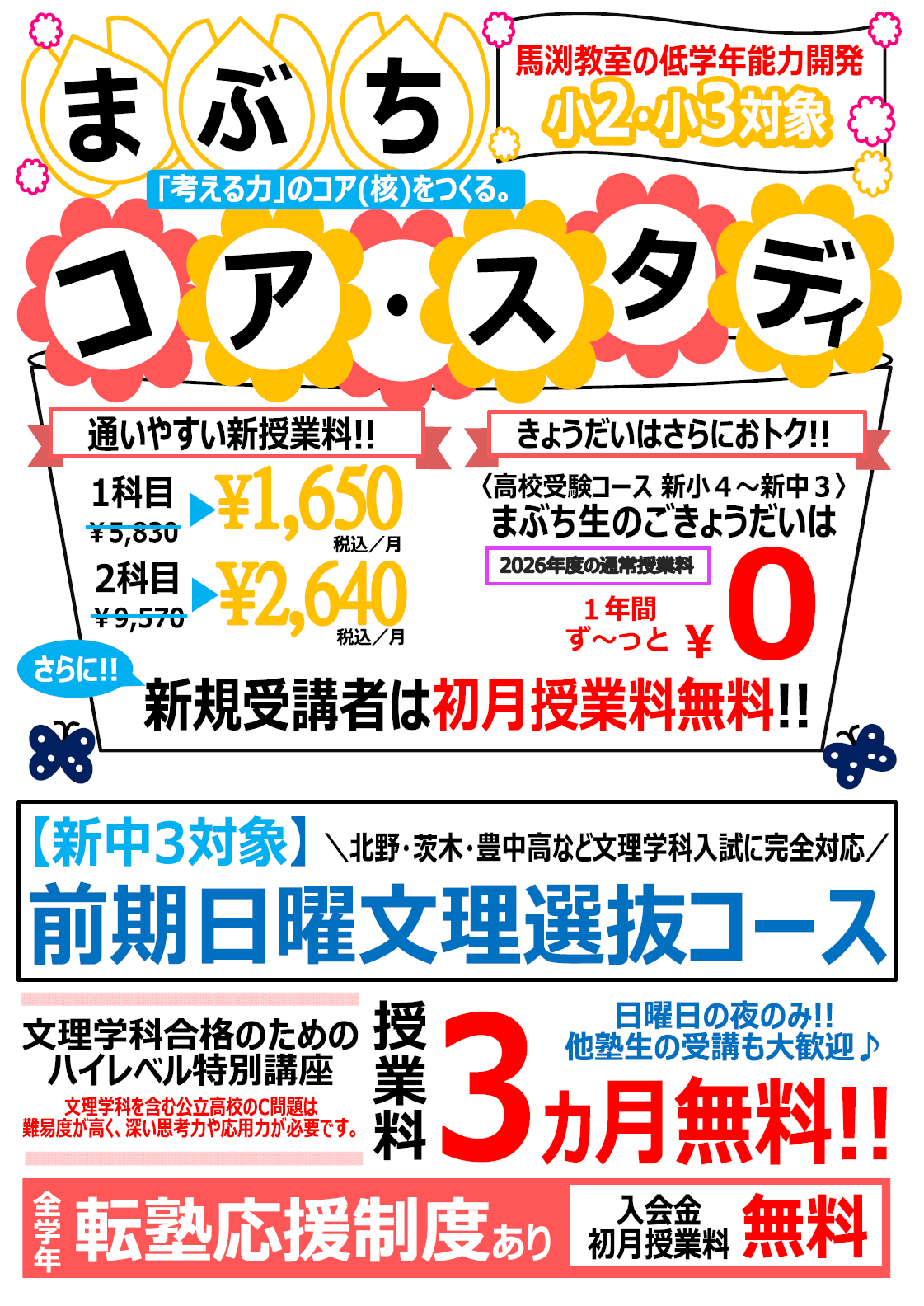 ご兄姉が小4~中3に在籍されているコア生は1年間「授業料が無料」です
