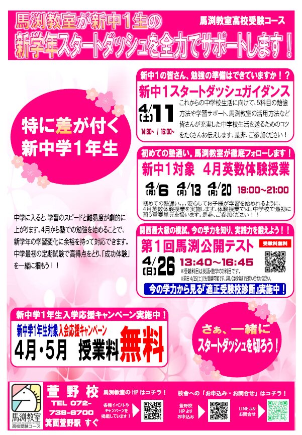 小4から中3のごきょうだい様が、馬渕教室高校受験コースに在籍されている期間中、新しく入室する小4から中3のごきょうだい様に適用されます。通常授業料1ヶ月分が無料となり、学年により既に授業料無料キャンペーンがある場合も追加で1ヶ月分が無料となります。