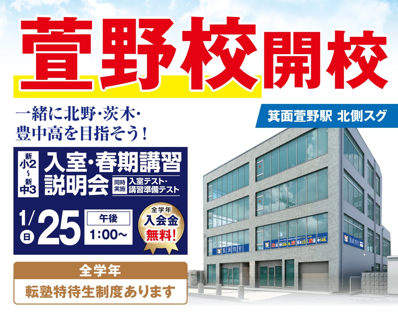 | 【主な通塾対象校】 小学校: 萱野小・萱野東小・止々呂美小 中学校: 第二中・第四中・止々呂美中 【萱野校の強み】 高校受験対策: 北野・茨木・豊中などの公立トップ校から難関私立校まで、最新の高校入試データに基づき志望校合格へ導きます。 定期テスト対策: 各中学校の進度に合わせ、内申点アップに直結する徹底したテスト対策を実施。点数アップにこだわります。 特別講習: 春期講習・夏期講習・冬期講習では、復習から応用まで成績を伸ばすカリキュラムを用意。小学生(小2〜小6)・中学生(中1〜中3)全学年を全力で応援します! |
