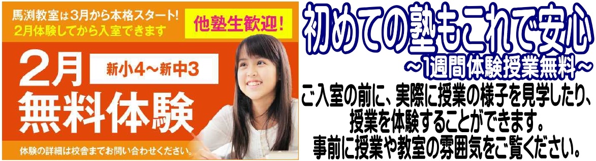 | A:馬渕教室では入室の際にテストを受験していただいています。このテストに合格された方は、塾の授業に十分についていける学力をお持ちです。つまずいた単元や分からない宿題などは随時、質問対応やまぶち欠席フォローWebにてフォローしますので、合格なさったなら安心して馬渕教室に入室してください。勉強やクラブ・習い事など目一杯頑張る君を馬渕教室は全力で応援します。 |