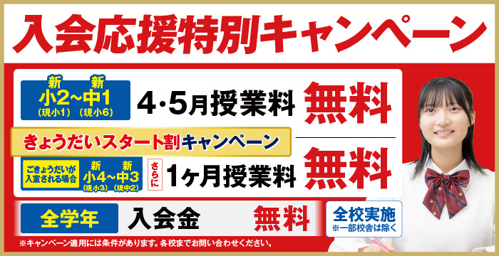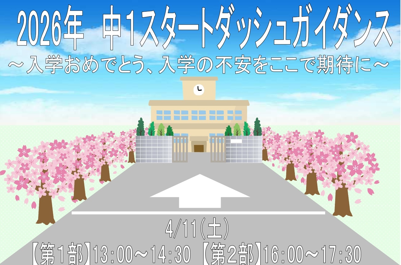 | ●中1スタートダッシュガイダンス● ご入学おめでとうざいます!新しい学校生活が始まる中で 「中学校の勉強って難しいの?」 「定期テストってどうやって対策すればいいの?」 といった不安をお持ちの方も多いのではないでしょうか。そんな不安を抱える方に最適なイベントです。 「最新の高校入試の仕組み」「最近の中学校の情報や中学校のでの勉強法」など、今知っておく重要な情報を 分かりやすくお伝えします。中学校生活のスタートで差がつく今だからこそ、正しい情報と準備が必要です。 「なんとなく」ではなく「戦略を持って」始めることで、この先3年間が大きく変わります。 ぜひご参加ください。 ●実施日時● 4月11日(土) 【第1部】13:00~14:30 【第2部】16:00~17:30 |