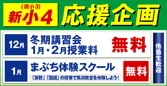 | A:馬渕教室では入室の際にテストを受験していただいています。このテストに合格された方は、塾の授業に十分についていける学力をお持ちです。つまずいた単元や分からない宿題などは随時、質問対応やまぶち欠席フォローWebにてフォローしますので、合格なさったなら安心して馬渕教室に入室してください。勉強やクラブ・習い事など目一杯頑張る君を馬渕教室は全力で応援します。 |