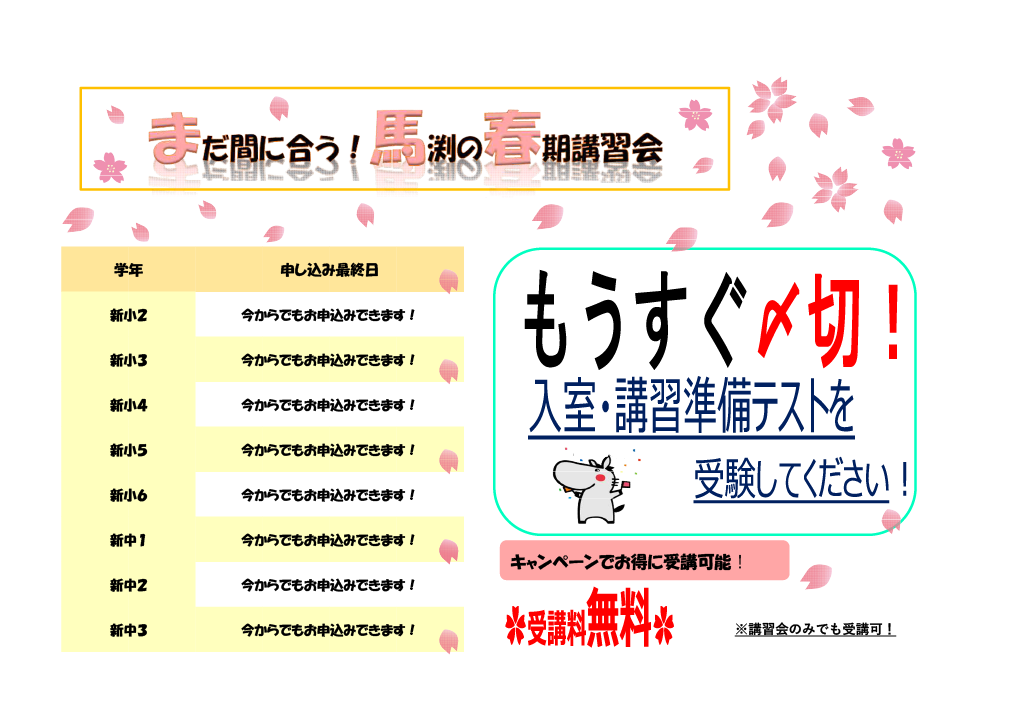馬渕教室へ入室を希望される方は、「入室テスト」を受験して入室資格を取得してください。受験には事前のお申し込みが必要です。校舎までお電話いただくか校舎窓口にてお申し込みください。