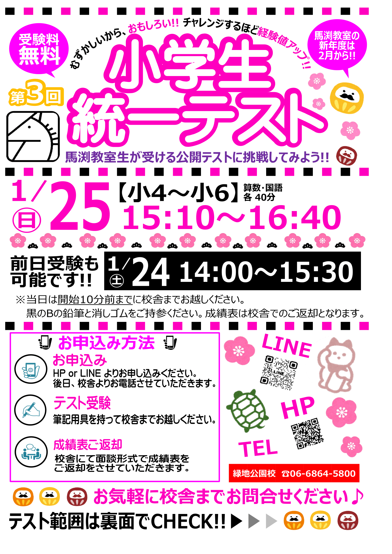 | 日時 | ※入室テストも同時開催 (ご都合の良い日時でも受験可能!) 1月17日(土)13:00-14:20 |