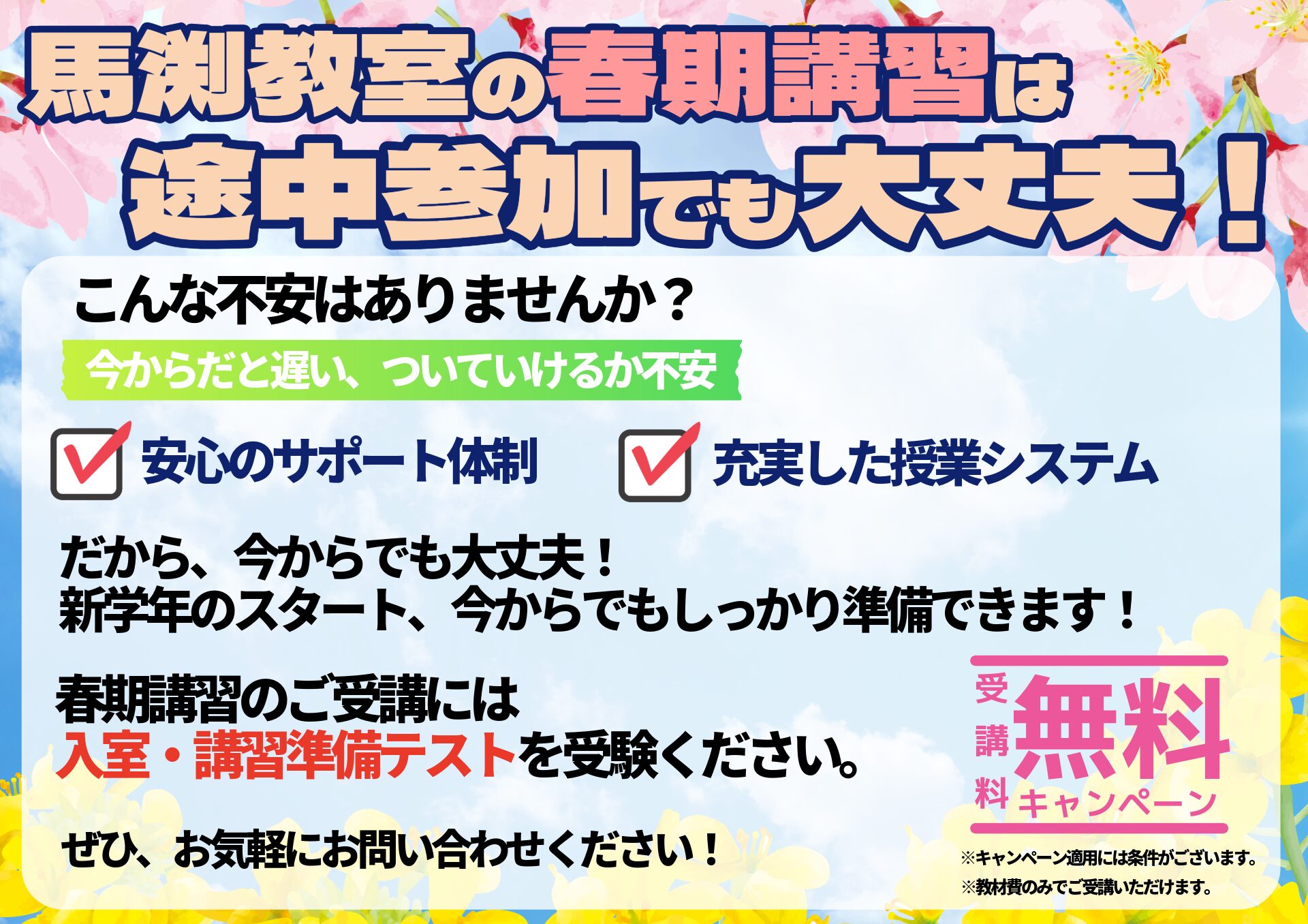 | 新小6(現小5) | 入会金無料 春期講習・4月授業料無料 転塾応援制度 |