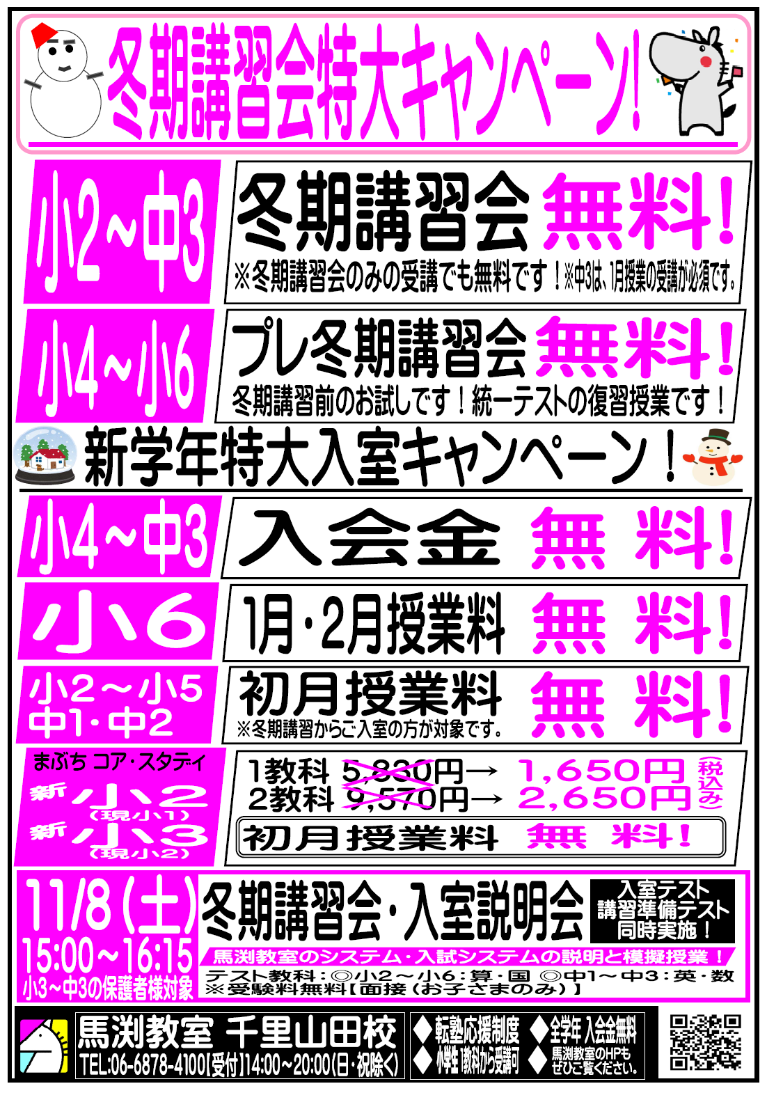| 新小2・新小3 | 入会金22,000円無料+夏期講習無料+11月1か月授業料無料+ 2025年度特別割引料金授業料 1科目コース 2科目コース (1年間ずっと適用されます!) |