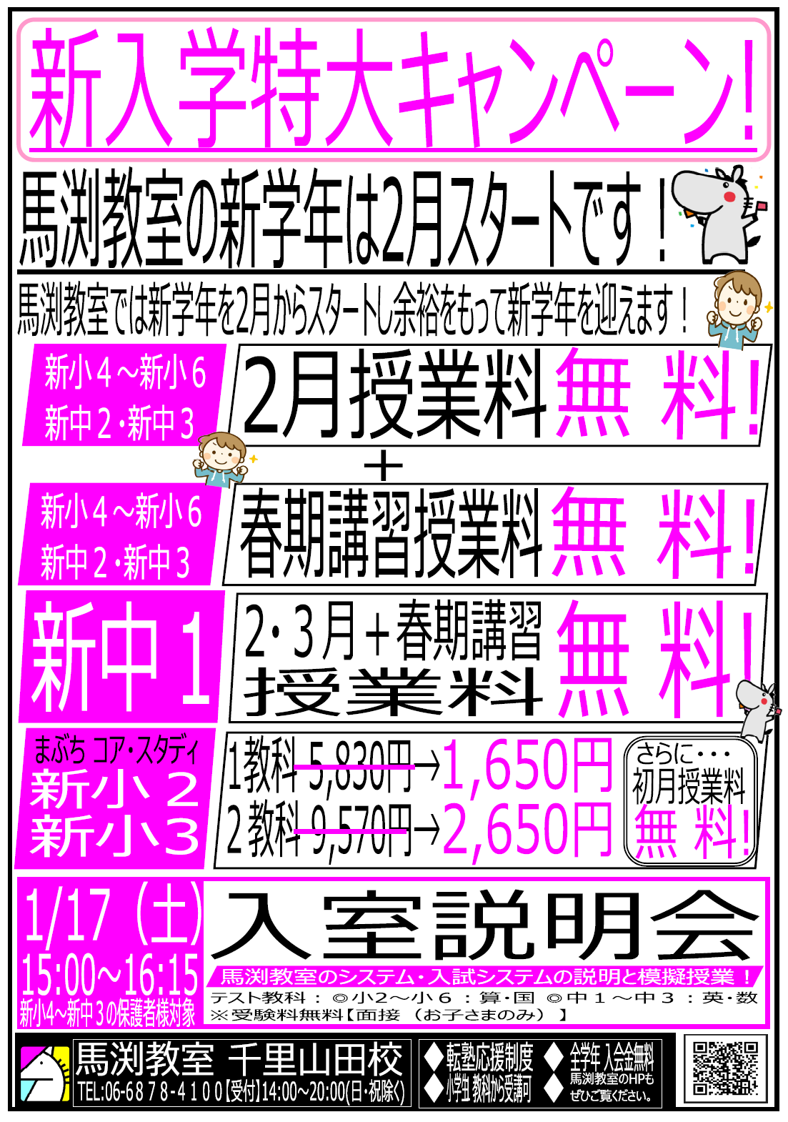| 新小6 | 2月授業料無料+春期講習授業料無料+転塾応援制度 |