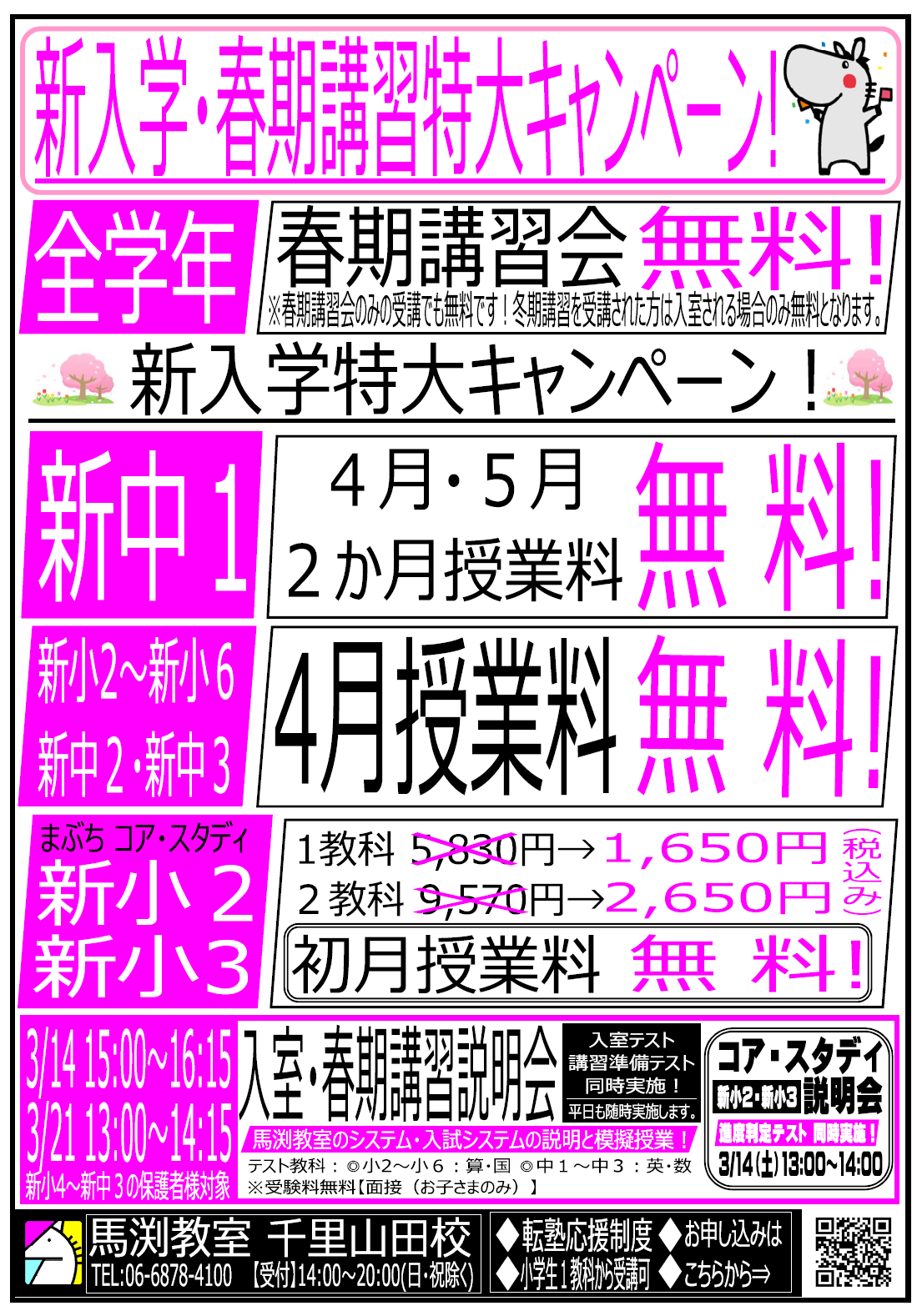 | 新小6 | 4月授業料無料+春期講習授業料無料+転塾応援制度 |