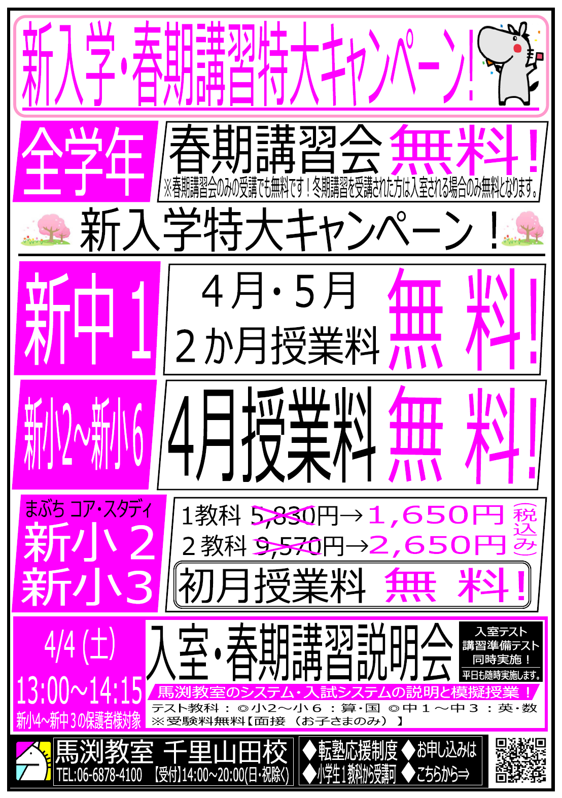 | 新小5 | 4月授業料無料+春期講習授業料無料+転塾応援制度 |