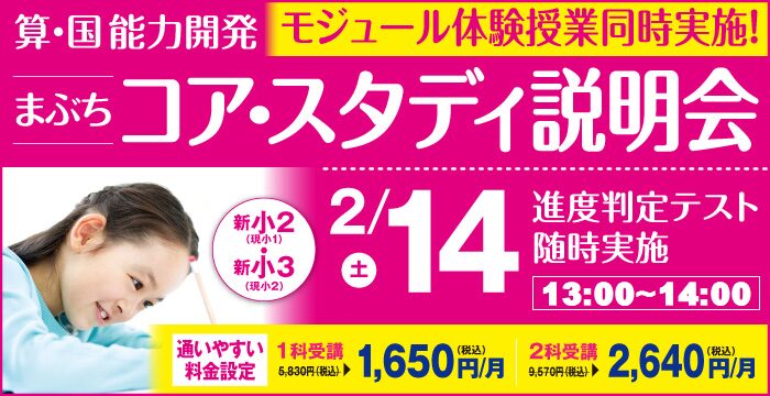 | 脳の吸収力がもっとも高いと言われる小学校の低学年の時期に、基礎学力・思考力の基盤を身につけるのが『まぶちコア・スタディ』です。一斉授業と個別指導のハイブリッド型指導で、お子様の学力を伸ばします。週1日コースと週2日コースをお選びいただけます。 受講にはまず、進度判定テストを受験してください。毎週土曜日実施しております。 進度判定テスト実施時間 15:00~15:30 試験教科(計30分): 国語10分 算数20分 持ち物:筆記用具 受験費用:無料 |