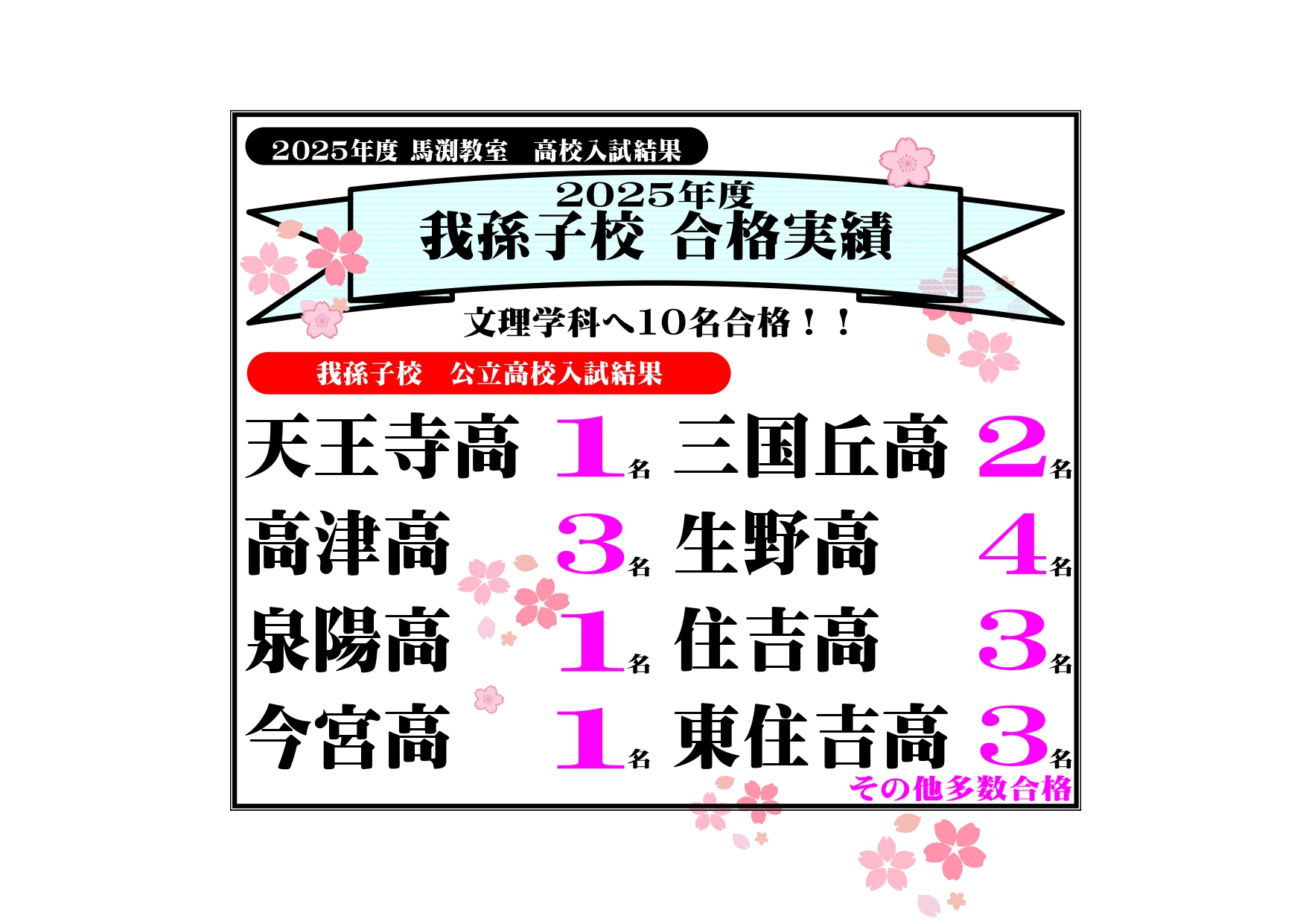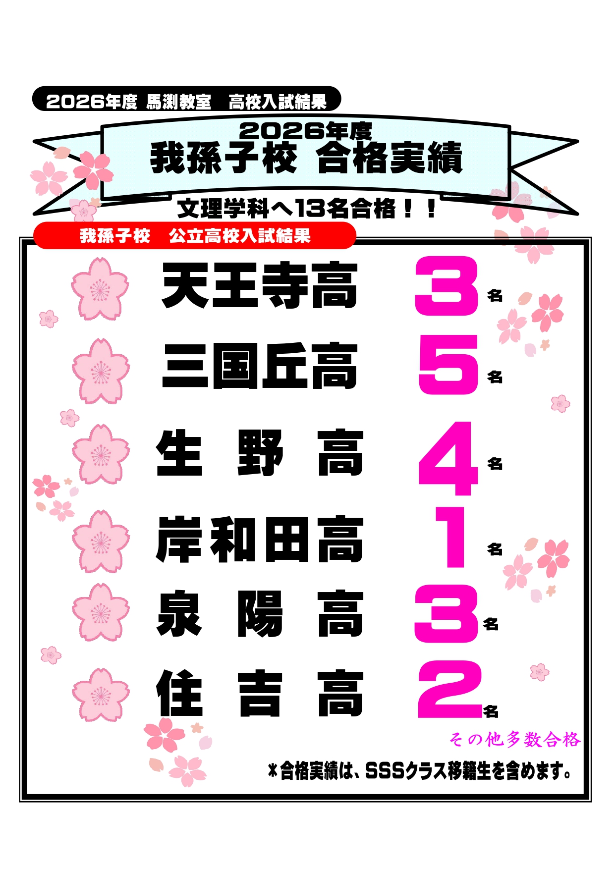 馬渕教室我孫子校は、開校以来、我孫子中・東我孫子中・三稜中・墨江丘中・我孫子南中・大和川中はじめ、広く矢田南中・矢田西中などたくさんの方にお通いいただいております。小学生も、苅田小・苅田北小・苅田南小・南住吉小・大空小・長居小・依羅小・山之内小・清水丘小などたくさんの方にお通いいただいております。